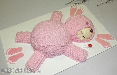 Of course, after a fifth or sixth glance you might start to think that isn't a bear at all, but rather a knitted pink snow suit with an unfortunate child stuck inside...being shunned by three invisible ghosts. Which makes SO much more sense for a baby shower. o.0
