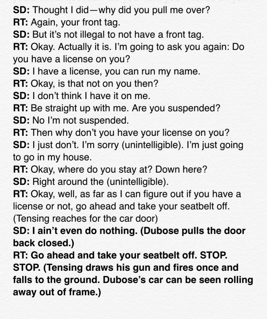 Here's the transcript of Ray Tensing Sam Dubose's interaction (as seen in body camera video) @JasonLawNews @WCPO