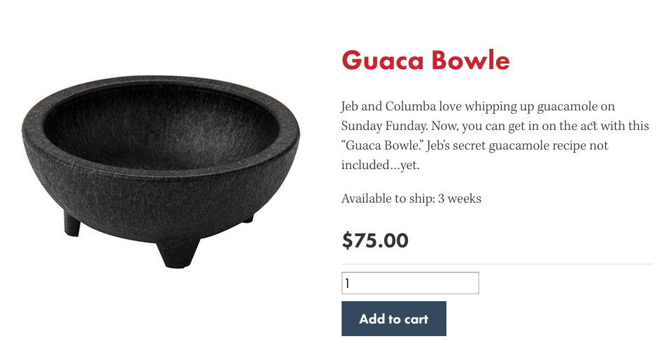 The description reads: "Jeb and Columba love whipping up guacamole on Sunday Funday. Now, you can get in on the act with this 'Guaca Bowle.' Jeb’s secret guacamole recipe not included…yet."