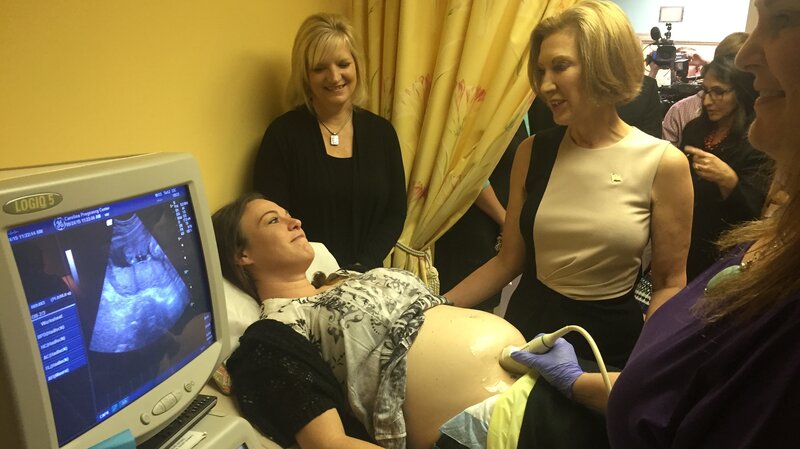 Carly Fiorina's presidential campaign took her to an exam room at a crisis pregnancy center in South Carolina Thursday. She crammed in, along with a pregnant woman, an OBGYN doctor, and a crowd of reporters.