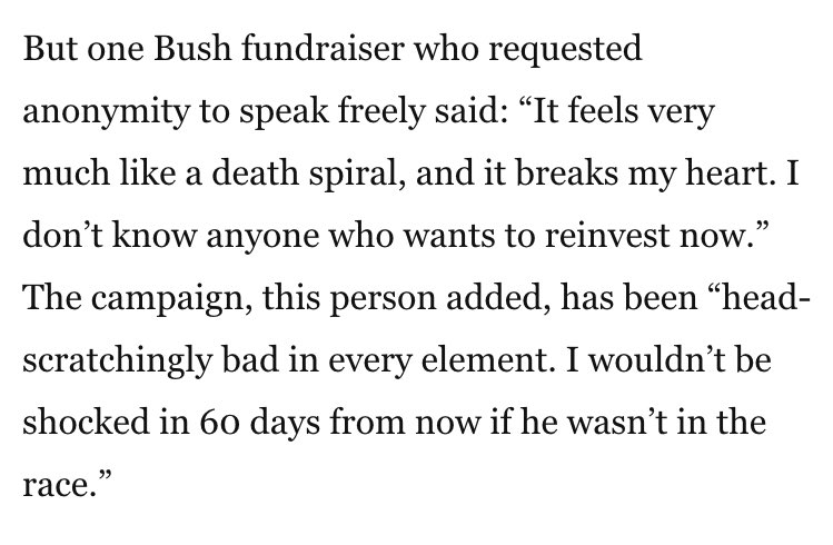 (9,426 posts)Maybe "America's Grandma" Babs will join him on the campaign trail? Dust off the pearls, sharpen her claws, bring along Dubya and push Poppy in a wheelchair. The people who collected $104 Million to finance him for the WH must be really upset at this point. Who claimed that he was the "smart one". Jeb! himself? If so, he was wrong about that too.