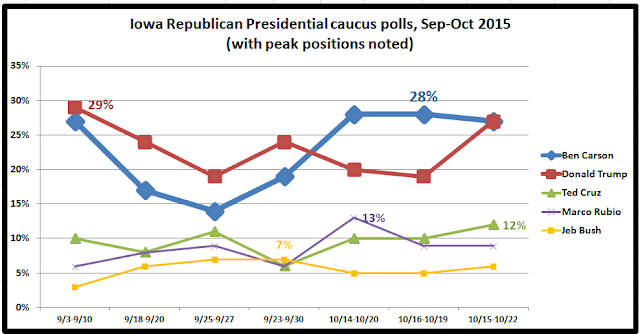 Carson has 36 percent of born-again/evangelical support. That looks like Santorums support did in 2012 in terms of what is needed to win. Carson is clearly connecting with the more conservative voters out there.... On average, Trumps net favorability is +18 percentage points in the last four Iowa polls. Thats basically the same as it was the last time the same four pollsters were in the field (late August/early September), when it was +22. But theres always been this sort of discord between Trumps topline (horse race) numbers and his net favorability. Wed have thought, based off his net favorability, that he wouldnt be leading the horse race. Carsons net favorability is +77 points! Hes much better liked. Net favorability isnt always linked to doing the best in the horse race, but better-liked candidates generally do better. So Ive always been skeptical of Trumps numbers....Trumps net favorability wasnt good to start off with. Whats finally happened, it seems, is that as voters are paying more attention, the better-liked Carson has jumped in front. Trump could remain just as popular as he is now and still lose because he isnt that popular. Voters just need to pay attention to the other candidates.... This has been one of the more interesting Trump phenomena; I believe Jon Robinson first discovered that Trump does better in non-live-interview polls. The belief being that people were afraid to admit they were voting for Trump to an actual person.