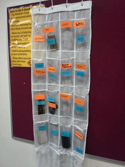 She has a box labeled "iJail". If she catches a kid using their phone for any other purpose, it goes in the box until after class.