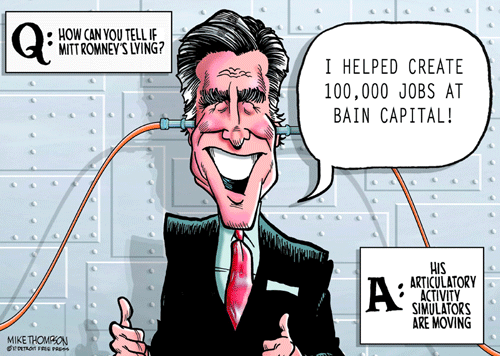 (17,199 posts)Huzzah! Following in the footsteps of Avenging Angel, who has done yeoman's work in exposing the stinking pile of mendacious horse manure that is Mitt Romney, I have been working to gather all of Willard's grotesque falsehoods into one central blog. I don't carry advertising on it, and I have not "monetized" it in any way. It's strictly a labor of love/hate. It can be found here. You see, I loathe and despise liars. I'm 60. I've been following politics since I was 12 (yes, a misspent youth). I vividly remember such world-class prevaricators as Richard Nixon. But for the life of me, I have never seen a more brazen liar than Romney running for president in my entire life. By God, I won't stand for it, not without a fight. Hey, I'm just one little person. But just as a few hundred thousand small fires can make a conflagration, a few hundred thousand dedicated truth-tellers can out Mitt Romney for the lying, unprincipled, morally bankrupt sociopath that he is. So, with this conviction in mind, here are Romney's lies all exposed: