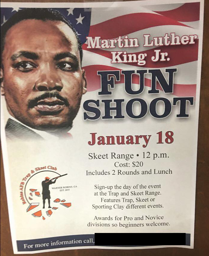 http://www.mediaite.com/online/air-force-officials-apologize-for-martin-luther-king-day-fun-shoot-flyer/Sometimes, even a second set of eyes arent enough to keep a monumental blunder from going to print, as a recent advertising flyer for a Martin Luther King, Jr. Day event at an Air Force shooting range demonstrates. Air Force officials in Georgia have pulled down and apologized for a flyer with a photo of the slain civil rights icon advertising a Martin Luther King, Jr. Fun Shoot: