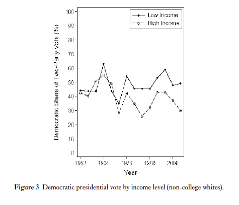 Among whites without a college degree, income has become a stronger predictor of the vote over time. But actually its those with less income, not more income, who are more likely to support Democratic presidential candidates. And again, there certainly no trend by which whites with below-average incomes and no college degree become more Republican.