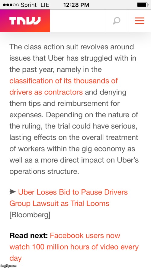 (5,252 posts)Uber driver's lawsuit regarding misclassifying them as subcontractors rather than employees. It's looking good for Uber drivers. Reimbursements and benefits, and the state of California, collecting payroll taxes.