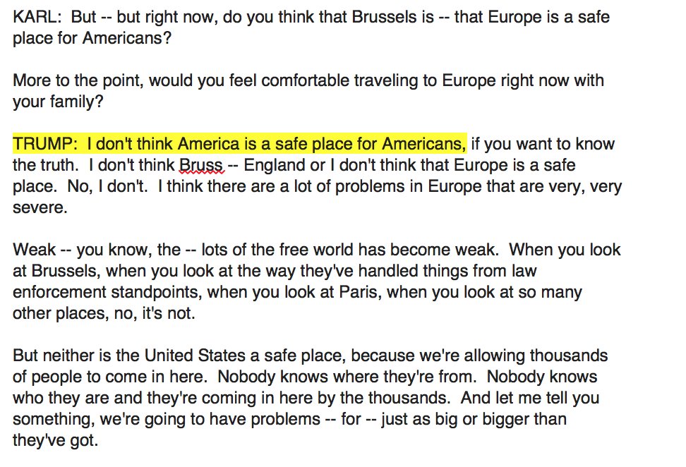 TRUMP: "I don't think America is a safe place for Americans" (Original Post)