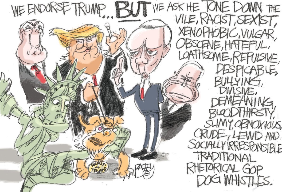 Trump isnt just a serial adulterer, but brags about it. Trump isnt just somebody who looks away when white supremacists make common cause with him; he encourages them, openly retweets their vile messages, and declines numerous requests to disavow them. Trump doesnt just use sketchy dodges to avoid military service; he insults the service of POWs, takes legal action against veterans trying to hawk street wares outside of his buildings, and says that his equivalent of Vietnam was negotiating the 1970s without contracting venereal disease. Trump openly incites violence at his rallies, doubles down on vile smears of female journalists who complain (rightly) about being improperly grabbed and jolted by his campaign manager, lies with such abandon that media fact checkers literally have trouble keeping up, says the best way to seduce women is to treat them like sh**, pretends to have opposed a war he supported, likens one opponent to a child molester, insults the looks of the wife of another opponent, and accuses the same candidates father of collaboration with JFK assassin Lee Harvey Oswald.