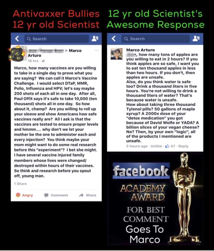 As a commenter put it, antivaccine beliefs must be incredibly fragile if a 12-year-old posting a snarky video to YouTube can threaten them so much. Most twelve year old kids would likely be intimidated by such a barrage of criticism and hatred, but Arturo handled it well: