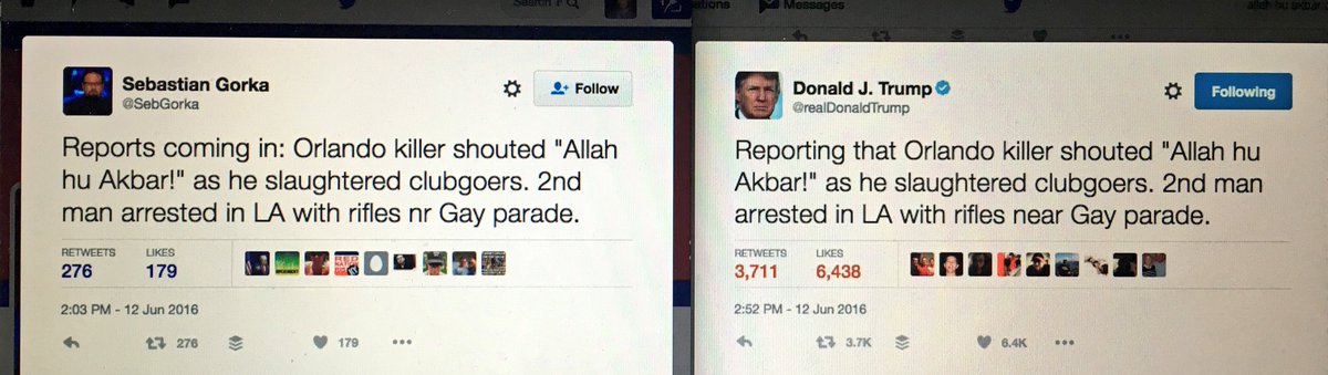 It looks like Trump flagrantly copy & pasted @SebGorka's unsourced 2:03pm tweet, tweaked it, and posted at 2:52pmIn the early moments after the attack, Trump began by sending out a vague reaction to the attack claiming he was thinking of the victims, only to follow it up with a random, unrelated smear directed at Hillary Clinton. Since then, hes released a torrent of anti-Muslim bigotry. Hes congratulated himself for being right about Muslims. He never once mentioned the heartbreaking fact that the attack was in an iconic gay night club and most of the victims were LGBTQ. Nor has he mentioned that this appears to be as much an anti-gay hate crime as an Islamic terror attack.