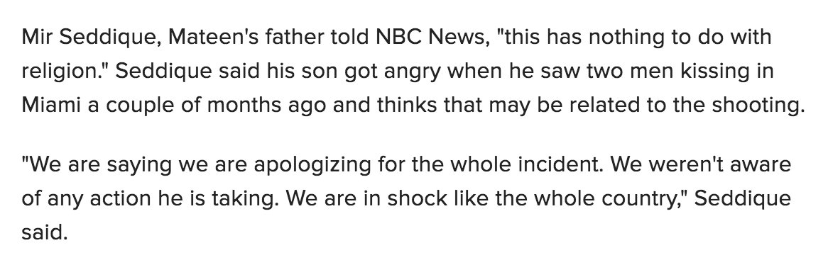 This OP presents Mateen's father as a valid and reasonable person. If words like that were spoken against any other minority group, DU would instantly banish those who promoted the speakers. Who touted such speakers. But even with the recent events, LGBT are not accorded the same respect others are given.