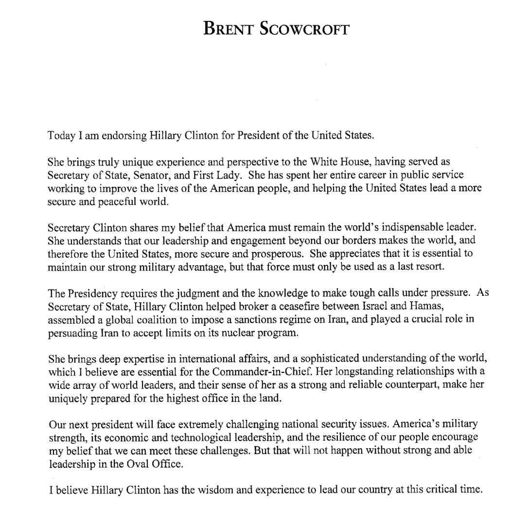 Brent Scowcroft (former Ford, HW Bush National Security Advisor) endorsement of Hillary Clinton (Original Post)