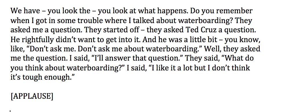 Related: Editorials & Other Articles, Issue Forums, Alliance Forums, Region ForumsTrump on waterboarding this evening in Ohio: "I like it a lot but I don't think it's tough enough."