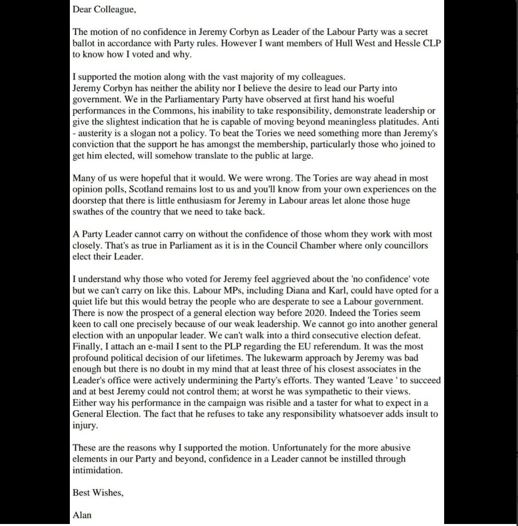 I am in no way being hyperbolic when I say that Corbyn poses an existential threat to it. If he remains, I think it is likely that most of the MPs will, not unreasonably, leave and set up their a new left-wing opposition party. The new party may or may not flourish (I fear it won't), but the old one will almost certainly wither.
