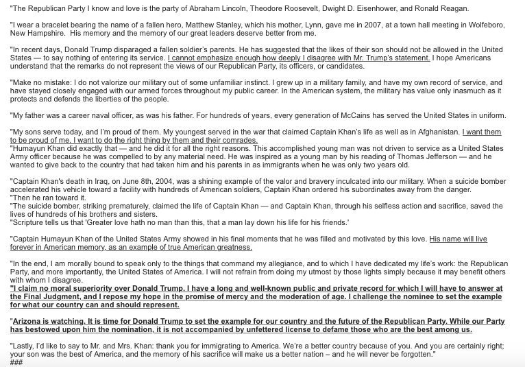 McCAIN: "I cannot emphasize enough how deeply I disagree with Mr. Trump's statement. I hope Americans understand that the remarks do not represent the views of our Republican Party, its officers, or candidates."