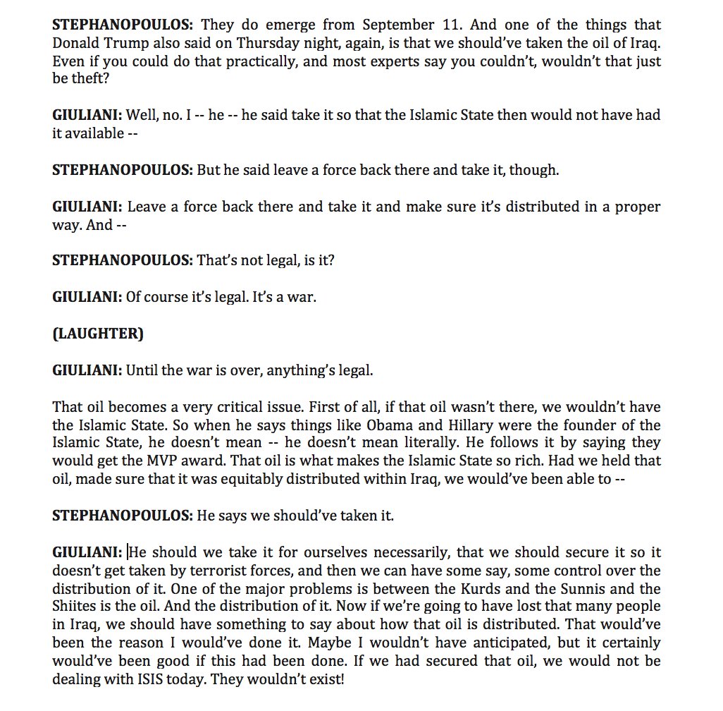 Giuliani to ABC on Trump's 'take the oil" plan: "Until the war is over, anything’s legal". (Original Post)