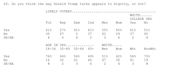 91% of Ds recognize that his comments appeal to bigotry, which speaks to how much deeper liberals think
