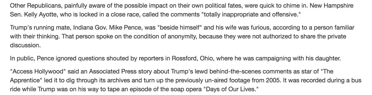 I want Mrs Pence to have a microphone stuck in her face and I want her to answer the same way she did before the VP debate, Tuesday night. Her response that night was basically that she didn't believe the things said about Donald because he had always been so nice and respectful to her and her kids.
