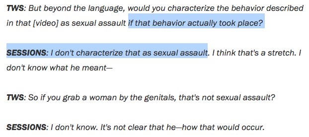 (93,734 posts)@JeffSessions is a U.S. Senator. He "doesn't characterize" grabbing a woman by the genitals "as sexual assault." http://www.weeklystandard.com/jeff-sessions-behavior-described-by-trump-in-grab-them-by-the-p-y-tape-isnt-sexual-assault/article/2004799?custom_click=rss