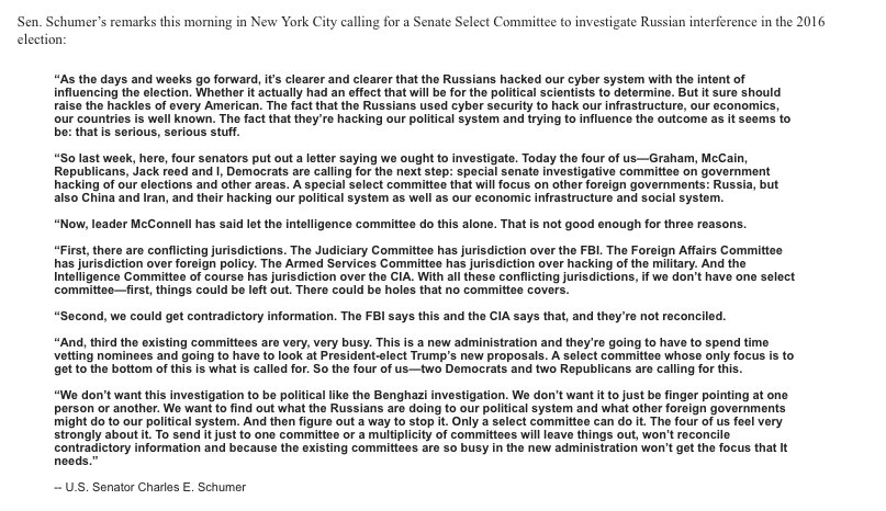 Sen. Chuck Schumer calling for Senate Select Committee to investgiate Russian interference in the election: