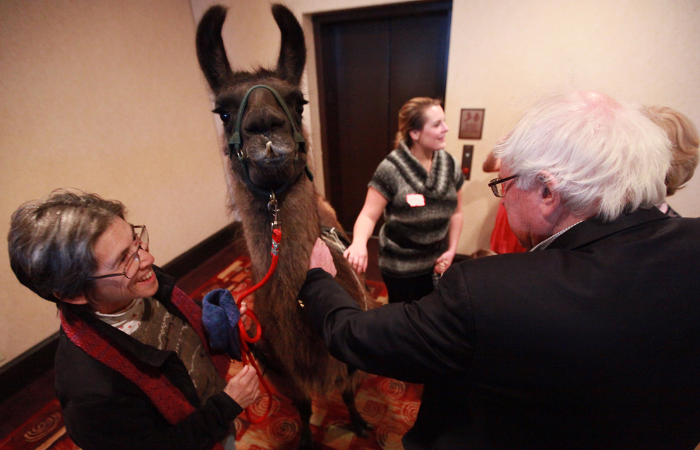 [font size="5" color="#660022"]Bernie Sanders (I-VT) pets "Peppersass" the Llama during the 31st Anniversary of the Pomerleau Holiday Party at the Hilton Hotel in Burlington, ...[/font]