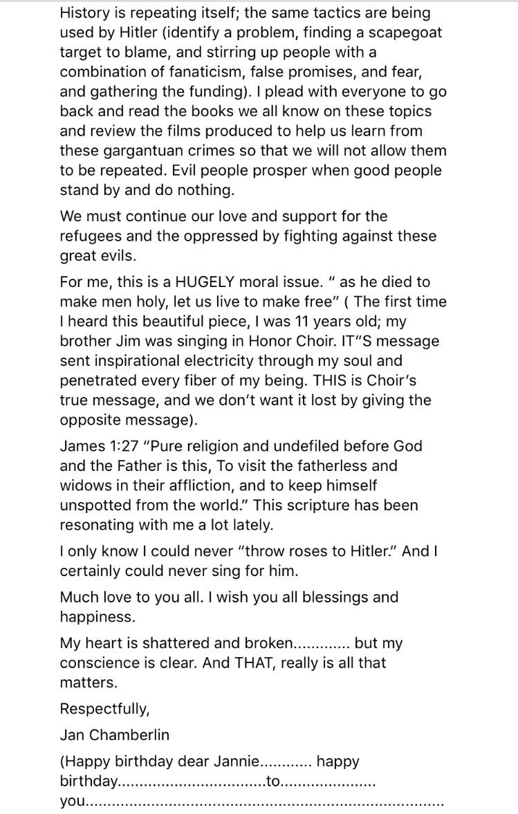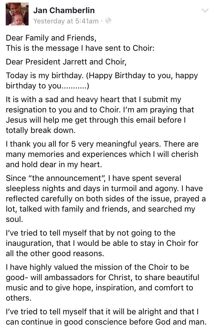 Ive tried to tell myself that by not going to the inauguration, that I would be able to stay in Choir for all the other good reasons, Chamberlin wrote in her resignation letter, which she later shared on Facebook.