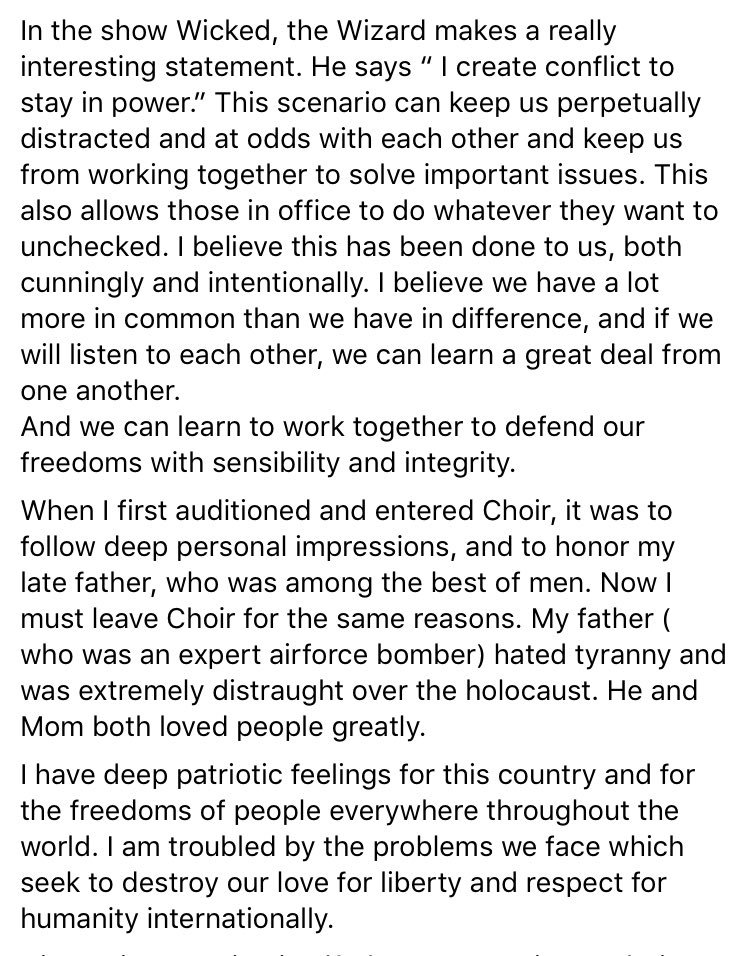 (150,879 posts)She felt strongly enough to make that statement. Then, I expressed sadness that it wouldn't affect the choir going to the inauguration, which had nothing to do with the person who resigned.
