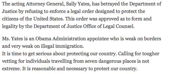 Sally Yates stayed on AT THE REQUEST OF TRUMP. This is the thanks she got. (Original Post) yellowcanine Jan 2017 OP