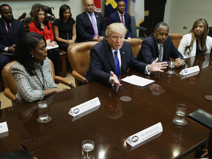 President Trump, flanked by Omarosa Manigault and House and Urban Development Secretary-designate Ben Carson, holds an African-American History Month "listening session" on Wednesday.
