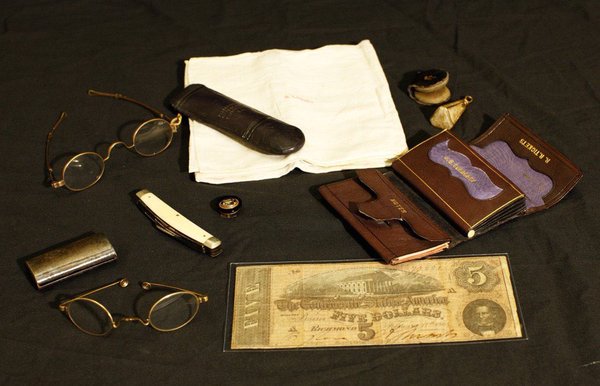 - The items consist of one pair of gold-rimmed spectacles with sliging temples and with one of the bows mended with string; one pair of folding spectacles in a silver case; an ivory pocket knife with silver mounting; a watch fob of gold-bearing quartz, mounted in gold; an oversize white Irish linen handkerchief with "A. Lincoln" embroidered in red cross-stitch; a sleeve button with a gold initial "L" on dark blue enamel; and a brown leather wallet, including a pencil, lined in purple silk with compartments for notes, U.S. currency, and railroad tickets. The wallet held a Confederate five-dollar bill and eight newspaper clippings. The clippings were from papers printed immediately before Lincoln's death, containing complimentary remarks about him written during his campaign for reelection to the Presidency. The Confederate five-dollar bill may have been acquired as a souvenir when Lincoln visited Petersburg and Richmond earlier in the month.