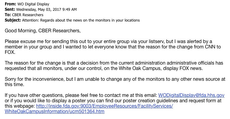 There was no directive or memorandum from the Administration that went out to employees about broadcast news channels displaying on monitors in common areas throughout the FDAs White Oak campus, an FDA spokeswoman told The Washington Post's Erik Wemple.