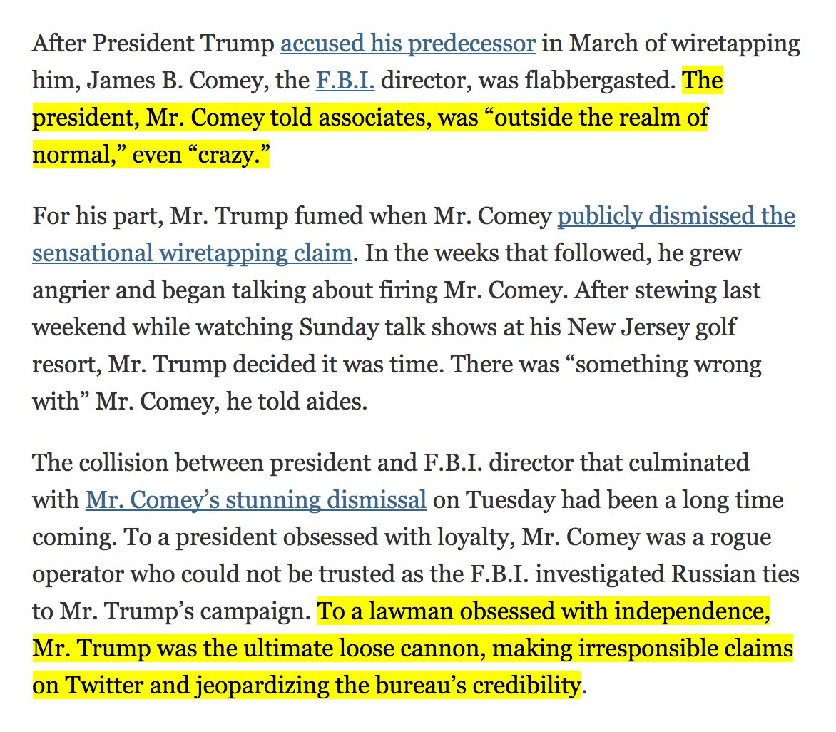 (64,025 posts)For his part, Mr. Trump fumed when Mr. Comey publicly dismissed the sensational wiretapping claim. In the weeks that followed, he grew angrier and began talking about firing Mr. Comey. After stewing last weekend while watching Sunday talk shows at his New Jersey golf resort, Mr. Trump decided it was time. There was something wrong with Mr. Comey, he told aides.