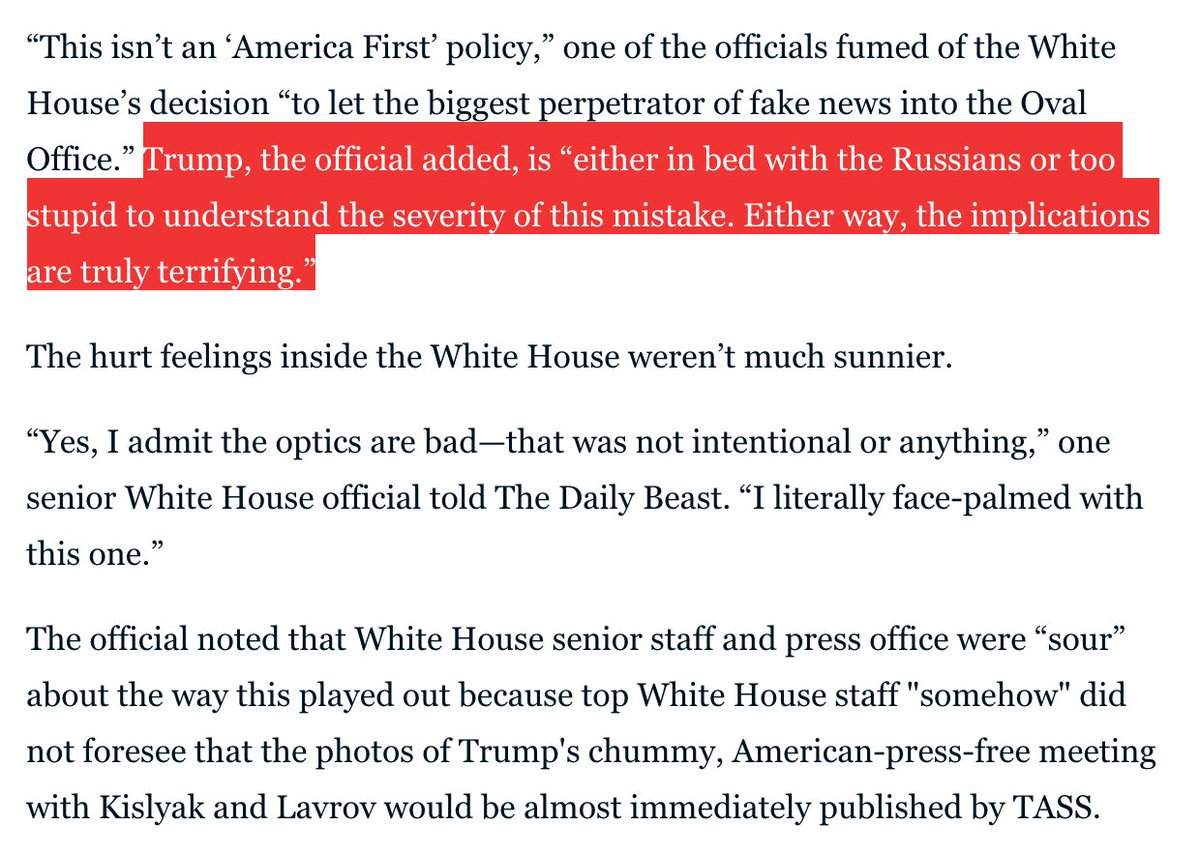 (11,112 posts)"Administration officials also claimed on Thursday that they had been misled into believing that TASS was documenting the event internally, just as an official White House photographer on hand for the meeting was. We were not informed by the Russians that their official photographer was dual-hatted and would be releasing the photographs on the state news agency, an administration official told The Washington Post."