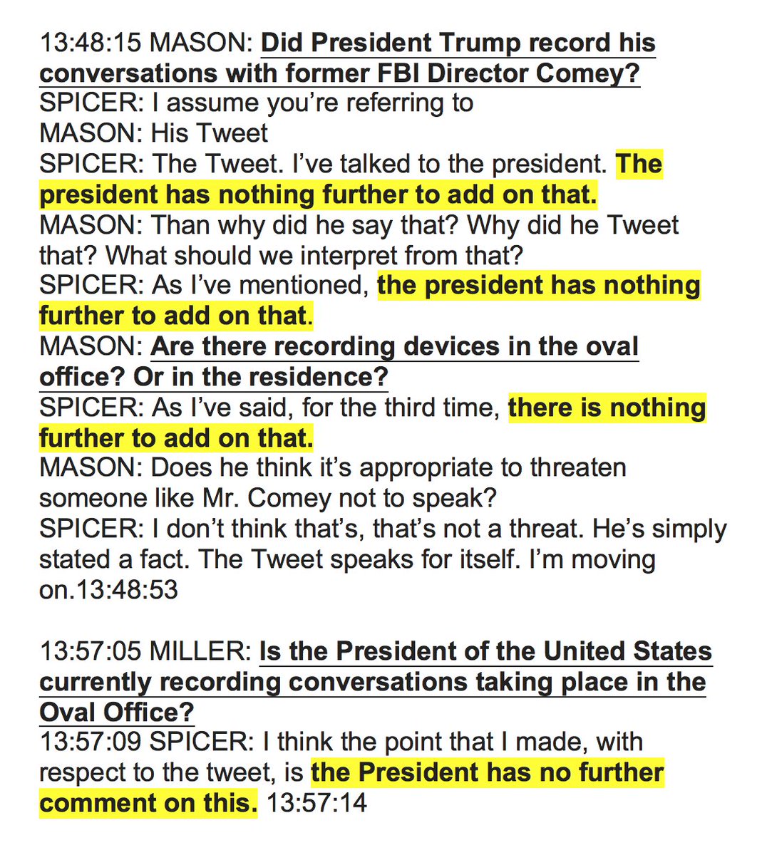 (93,728 posts)The White House is refusing to say whether President Trump has a secret WH recording system. Extraordinary moment.