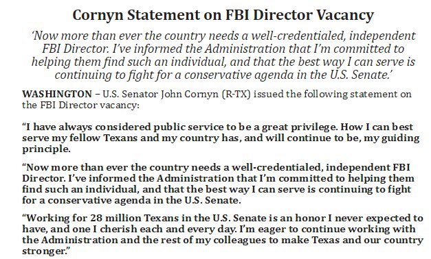 (24,939 posts)Not that I'm complaining about Cornyn turning the job down. Actually, sort of scary to think about who we might get stuck with now and for the next few years because nobody with any real integrity will want to take the job, which is why, as much as Comey sucked, he at least had some shred of professionalism and integrity.