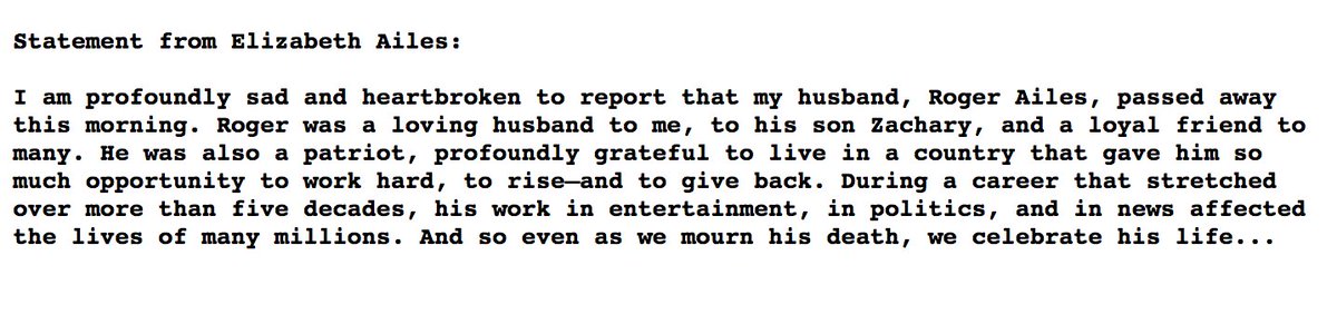Whoa! Statement from Roger Ailes' wife on @DRUDGE_REPORT says Ailes has died http://www.drudgereport.com