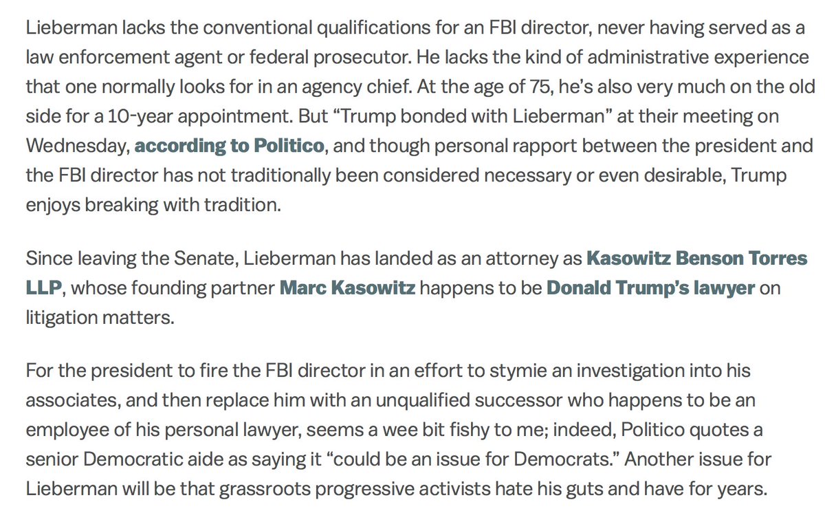 My suspicion is that Lieberman is still mad at Dems for being primaried out Le Gaucher May 2017 #1
