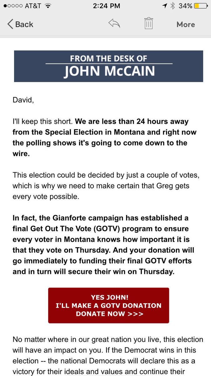 McCain sent out a "we're down to the wire" fundraising email for Gianforte today (Original Post)