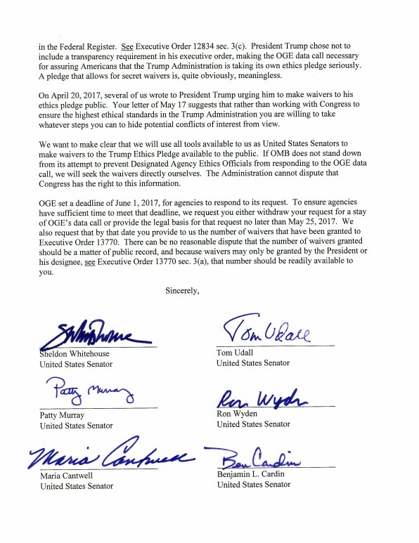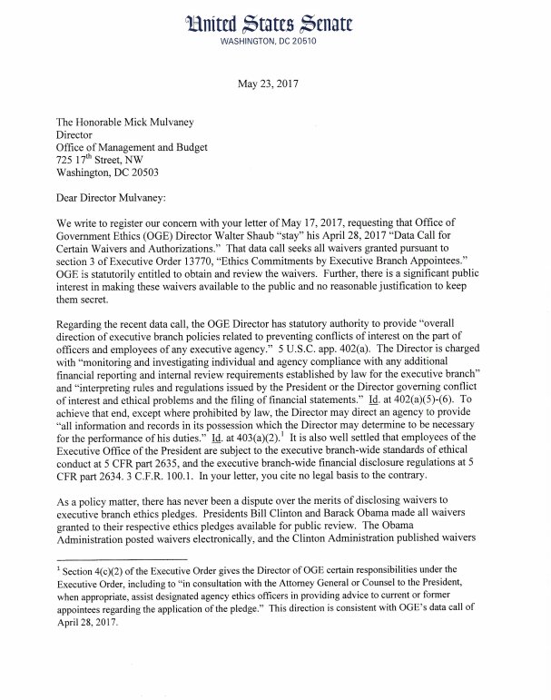 18 Democratic Senators are demanding explanation on WH attempts to block ethics waiver disclosures