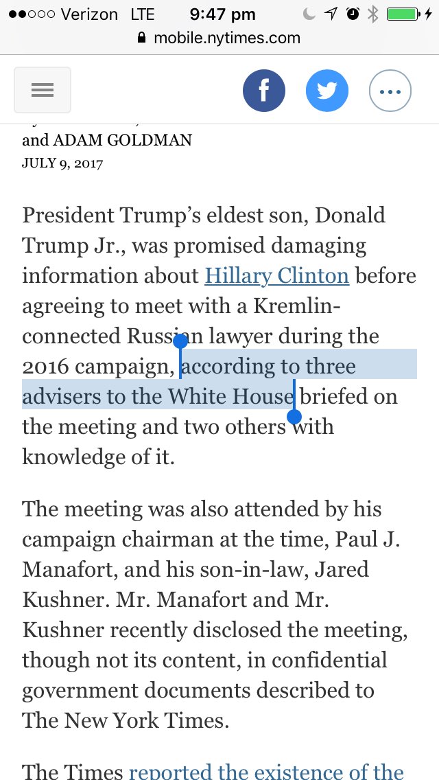 1. What I suspect is the most important detail in this story is the sources. The Times reports that they got the information from three advisers to the White House briefed on the meeting and two others with knowledge of it. They apparently talked after the release of the first story. This is highly, highly significant. Needless to say, advisors to the White House are not in the business of taking highly damaging stories and volunteering new information which makes them catastrophically damaging. The only reason a Presidents allies ever do something like that is either to get ahead of something much more damaging or get a first crack at shaping the public understanding of something much more damaging. Theres really no other explanation. We dont know yet what drove them to volunteer such highly damaging information. Five of them did it. It wasnt a matter of one person going rogue