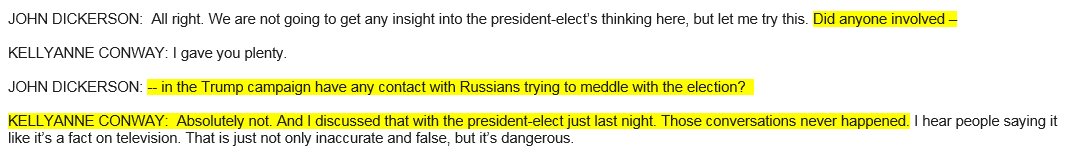 Kellyanne Conway said no Trump advisor or campaign staff had contact with Russia on 12/18/16: "Absolutely not."