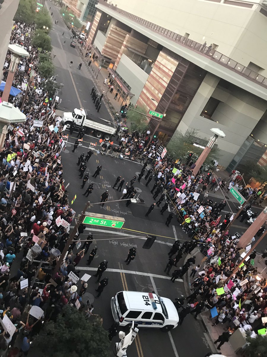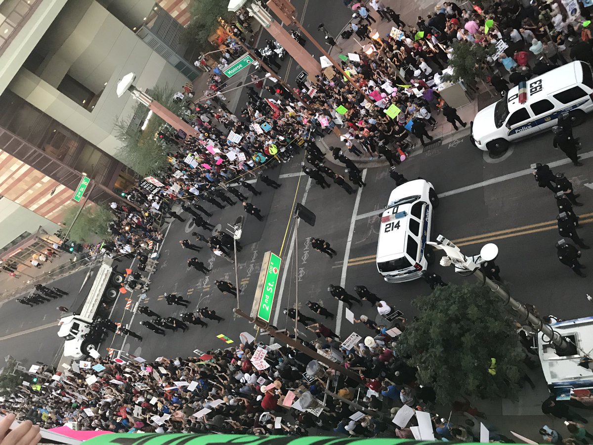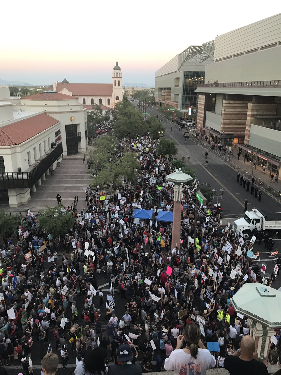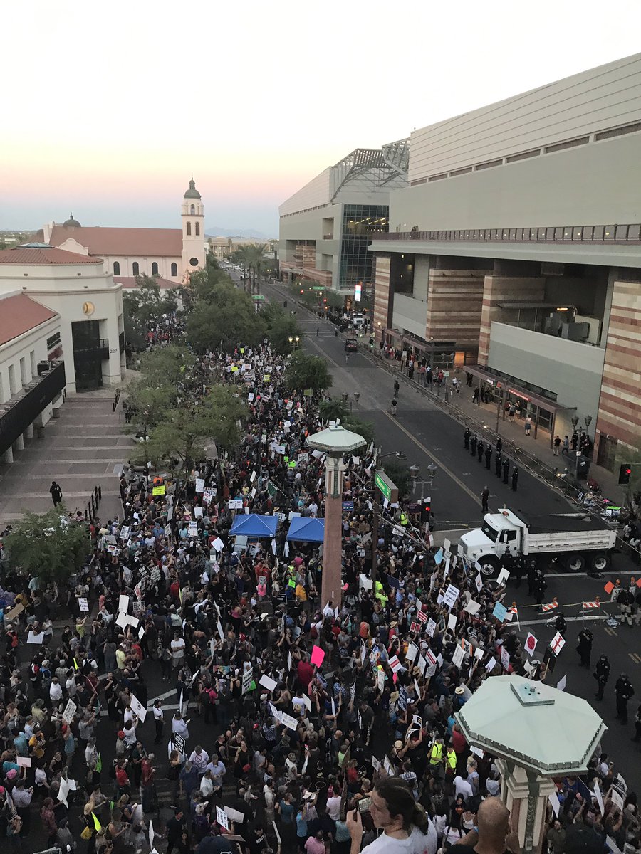 Views from the roof of the parking lot across from Phoenix convention center. People packed on every floor. #trumprally protest