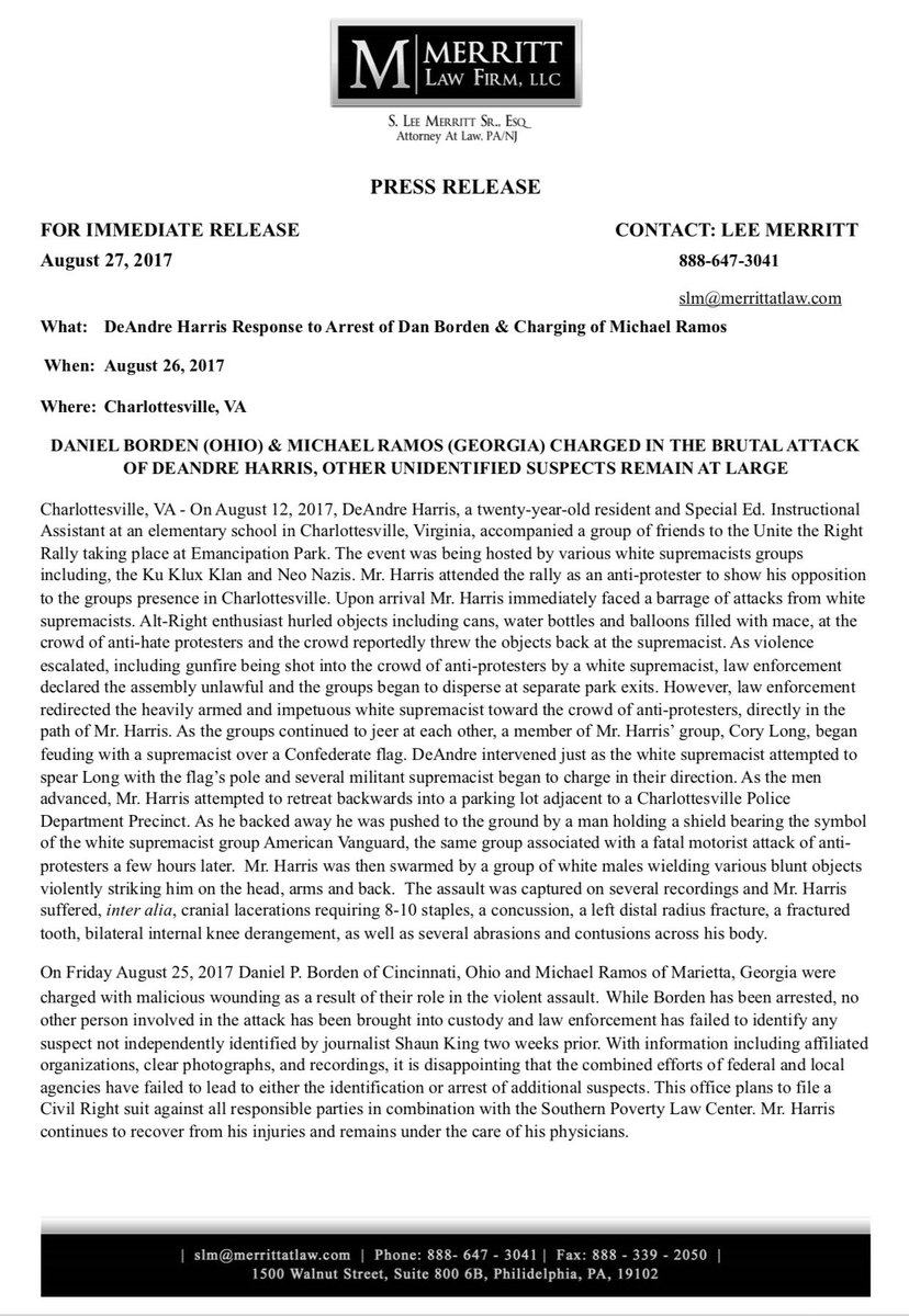 (33,707 posts)Daniel Borden and his family have cooperated fully with the FBI in its investigation of the events in Charlottesville. When Dan was advised yesterday afternoon that a warrant for his arrest had been issued by Virginia authorities, he immediately surrendered himself to the FBI and, later, the Hamilton County Sheriff's Department.
