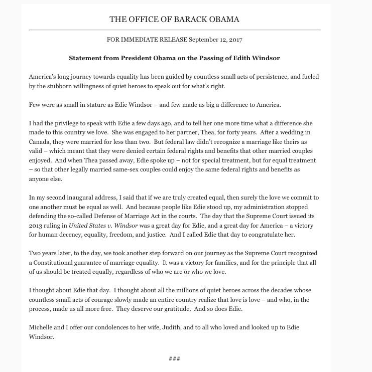 President Obama's statement on the passing of civil-rights hero Edie Windsor. (Original Post)