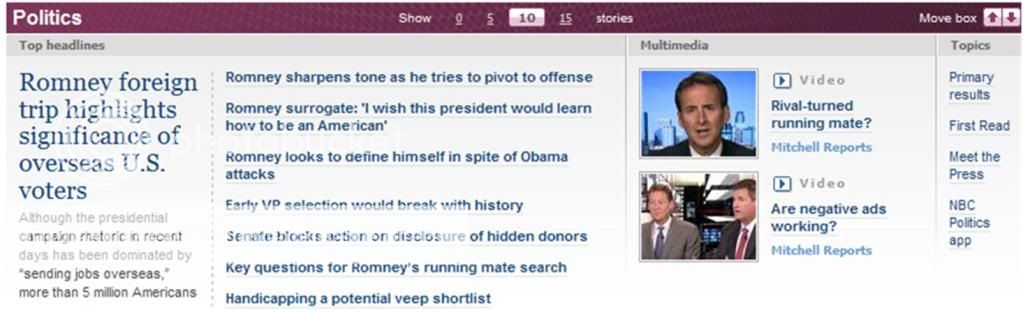 i just got up. my routine is to go to the - what used to be the msnbc page - nbc news now, and watch rachel maddow while i get ready for work. these are the "politics" headlines available at this moment: