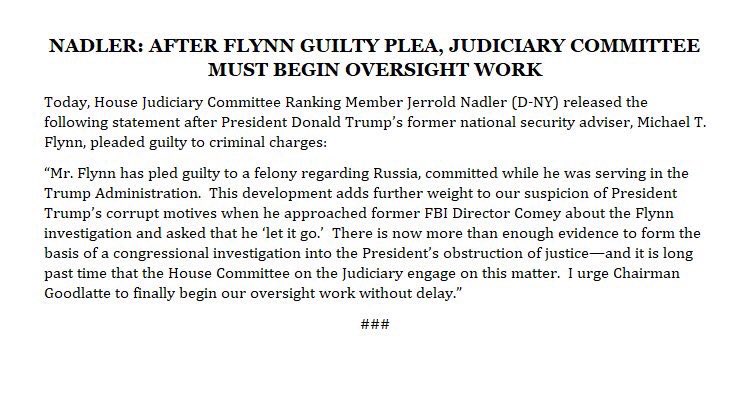 House Judiciary ranking member Jerry Nadler: “There is now more than enough evidence to form the basis of a congressional investigation into the President’s obstruction of justice—and it is long past time that the House Committee on the Judiciary engage on this matter.”