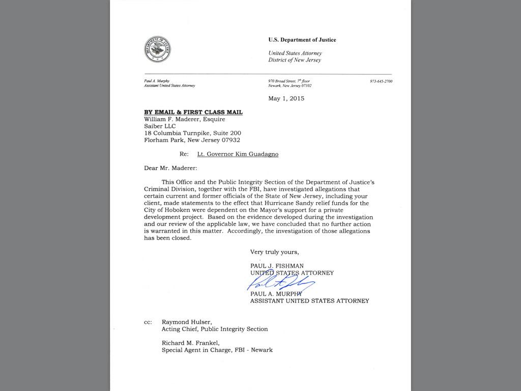 Guadagno shared a letter from U.S. Attorney Paul Fishman's office Saturday on Twitter and said it vindicated her initial responses to Zimmer's allegations: