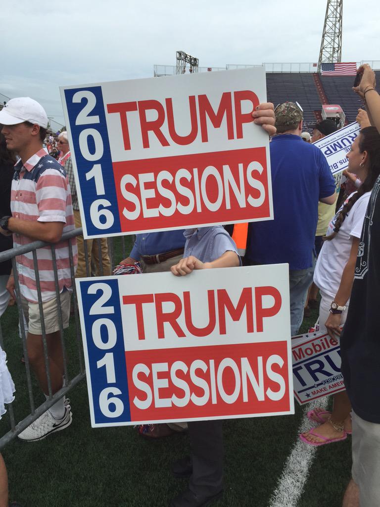 At @realDonaldTrump rally people holding "Trump/Sessions 2016" signs. Sessions applauded Trump's immigration plan.