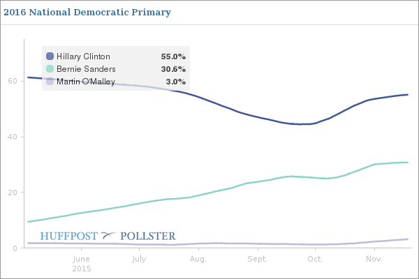 Since the beginning of October (which included a narrowing of the field), both Clinton and Sanders have each gained about 10% support.